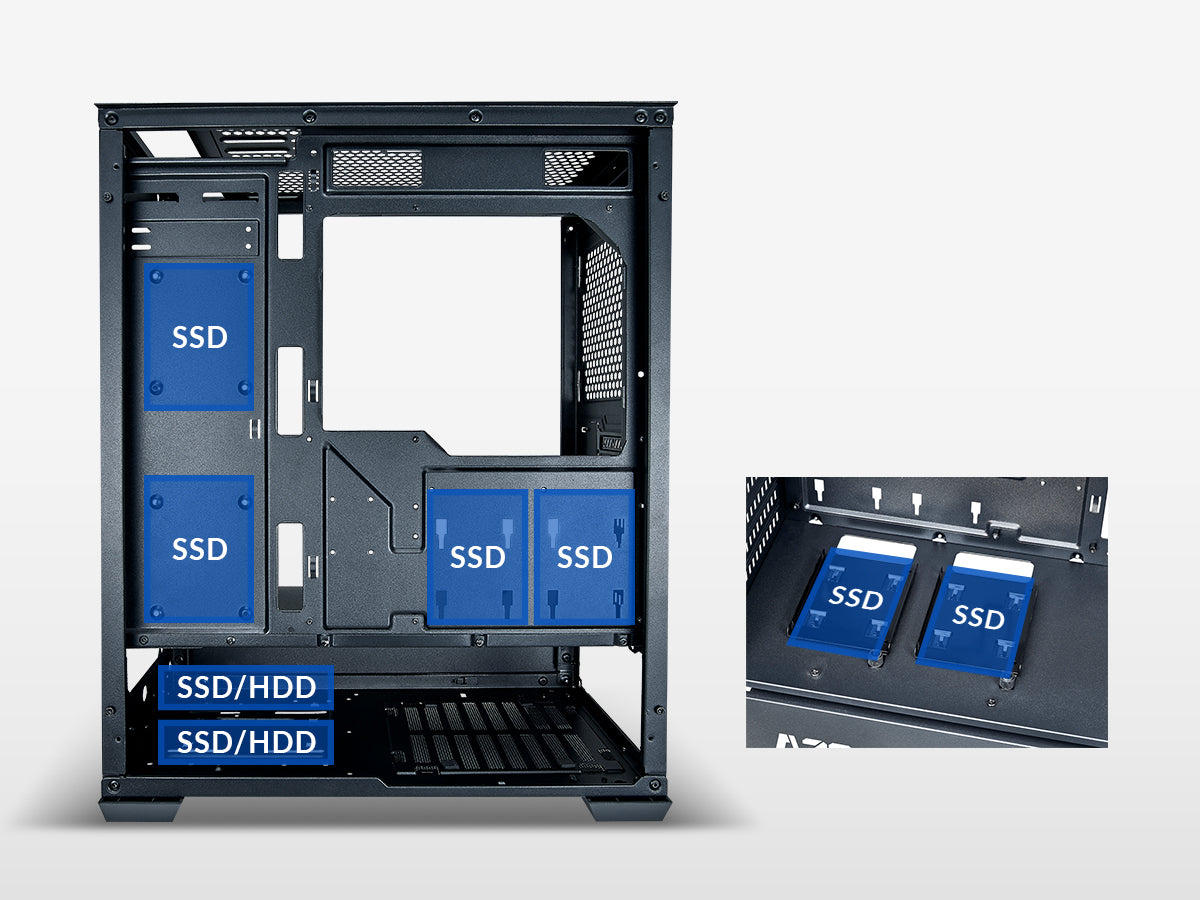 Top of drive cage supports 1 x 3.5" HDD or 1 x 2.5" SSD