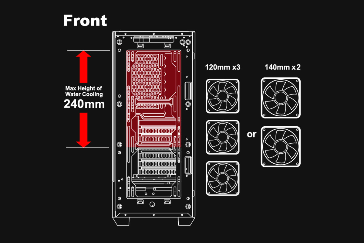 3 x 120 mm or 2 x 140 mm fan ports in the front
