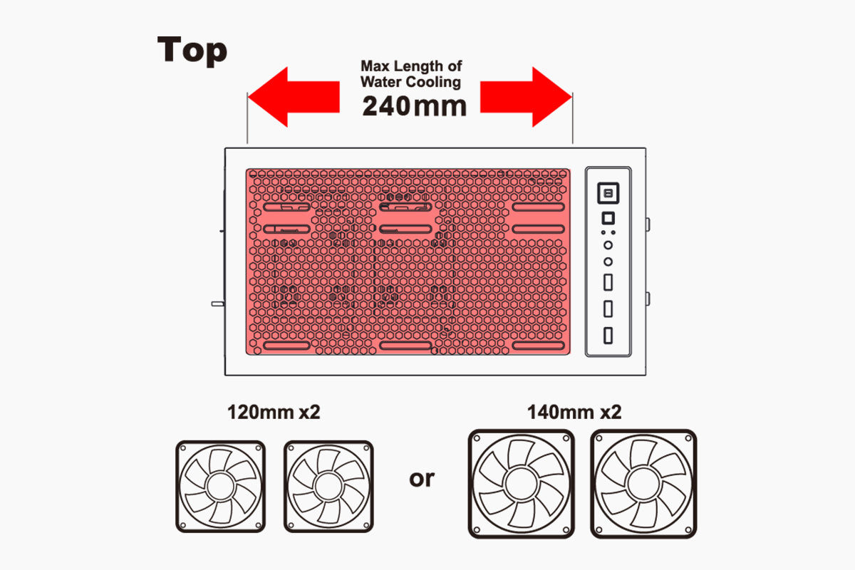 2 x 120 mm or 2 x 140 mm fan ports on the top