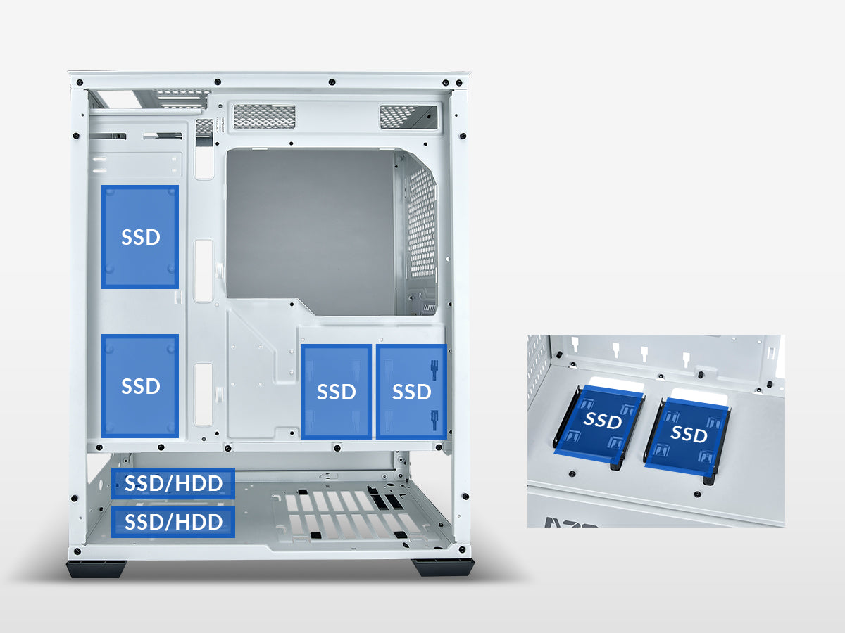 Top of drive cage supports 1 x 3.5" HDD or 1 x 2.5" SSD
