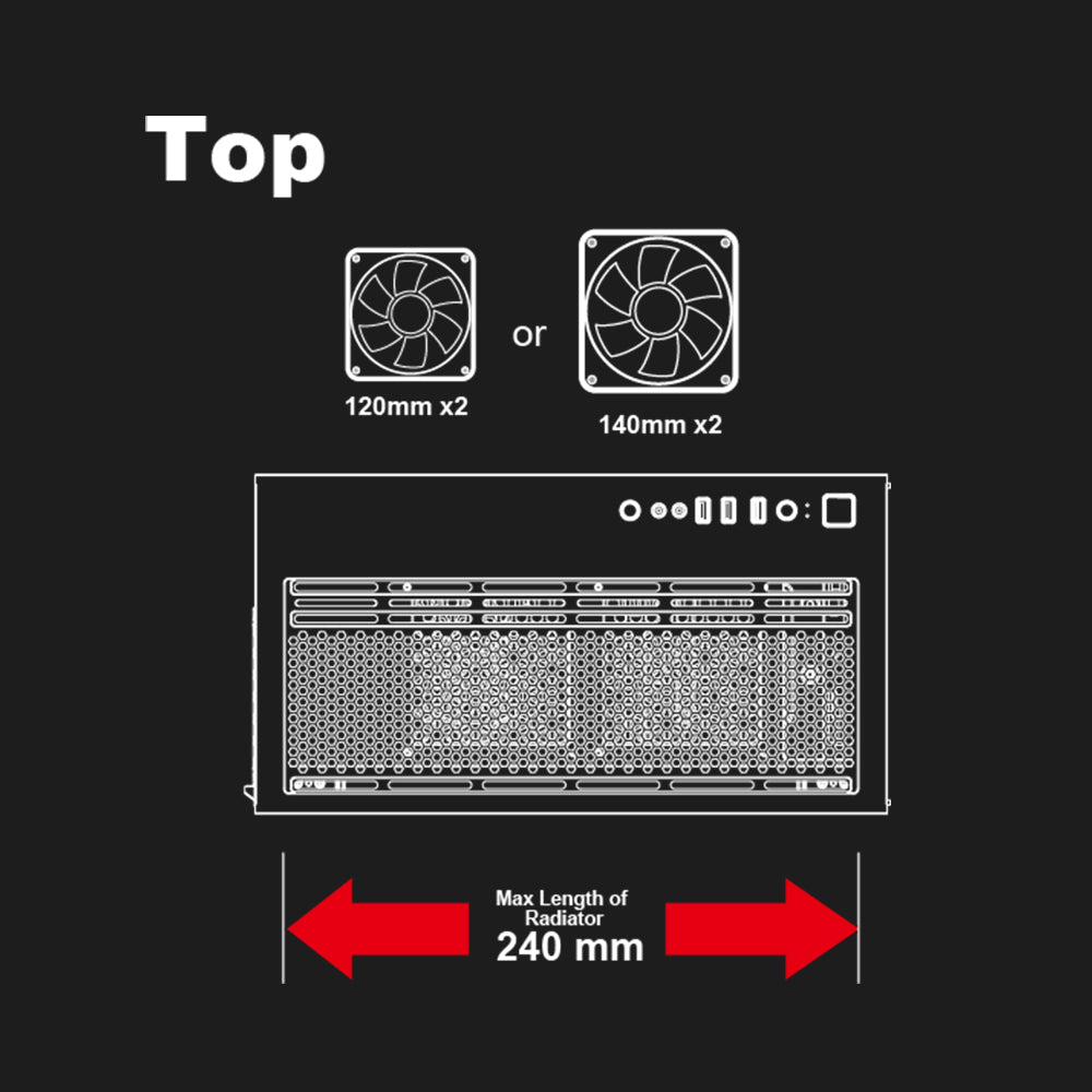 2 x 120 mm or 2 x 140 mm fan ports on the top