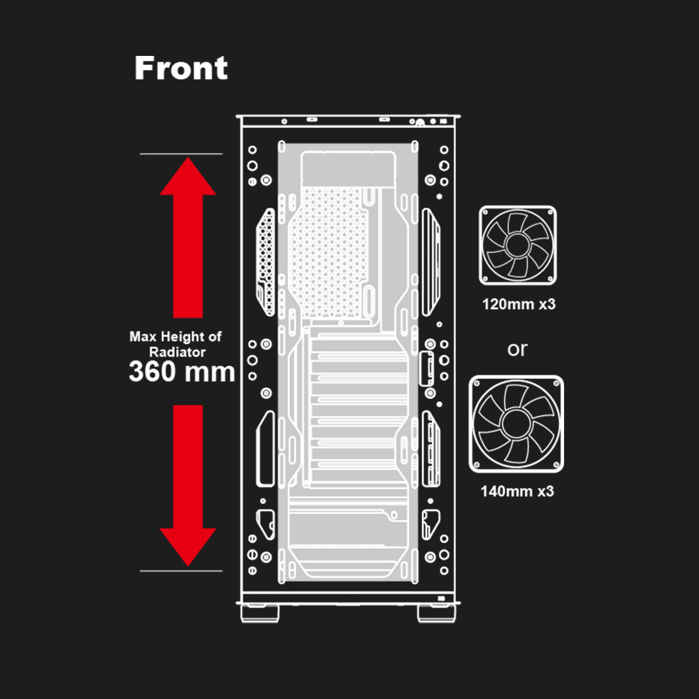 3 x 120 mm or 3 x 140 mm fan ports in the front