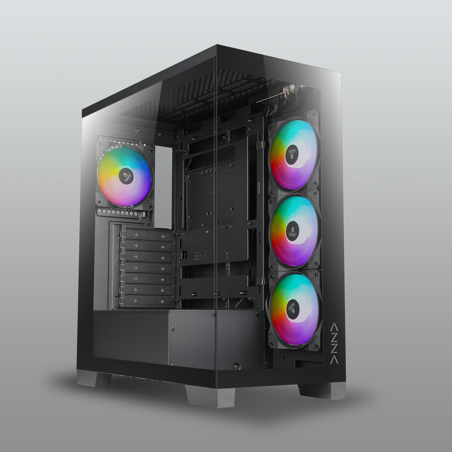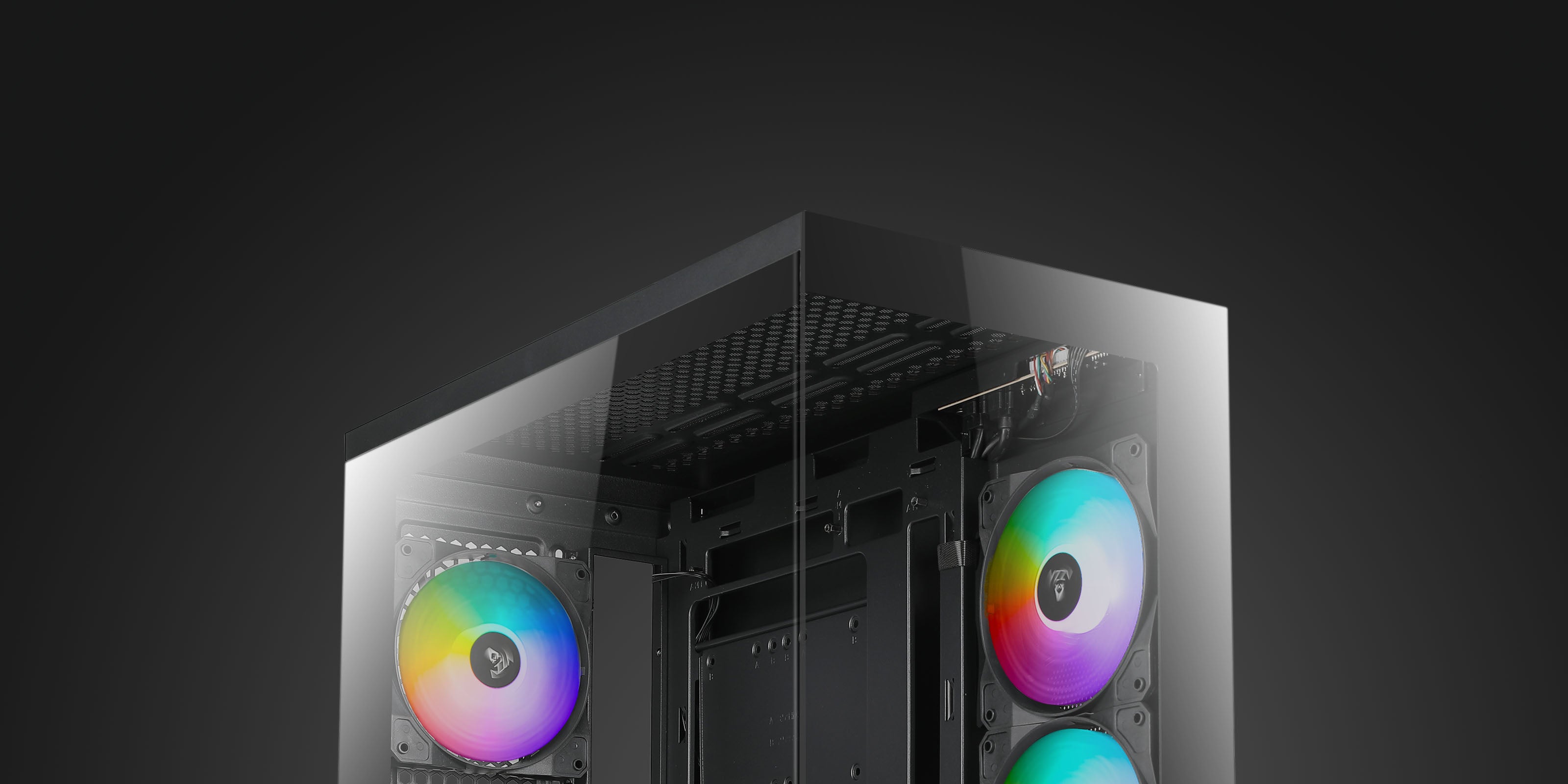 270° full-view tempered glass panel. The Cove is reminiscent of the ocean’s waves cascading onto the shore at midnight. The inner space supports back-connect motherboards for a cleaner build and a better visual showcase.