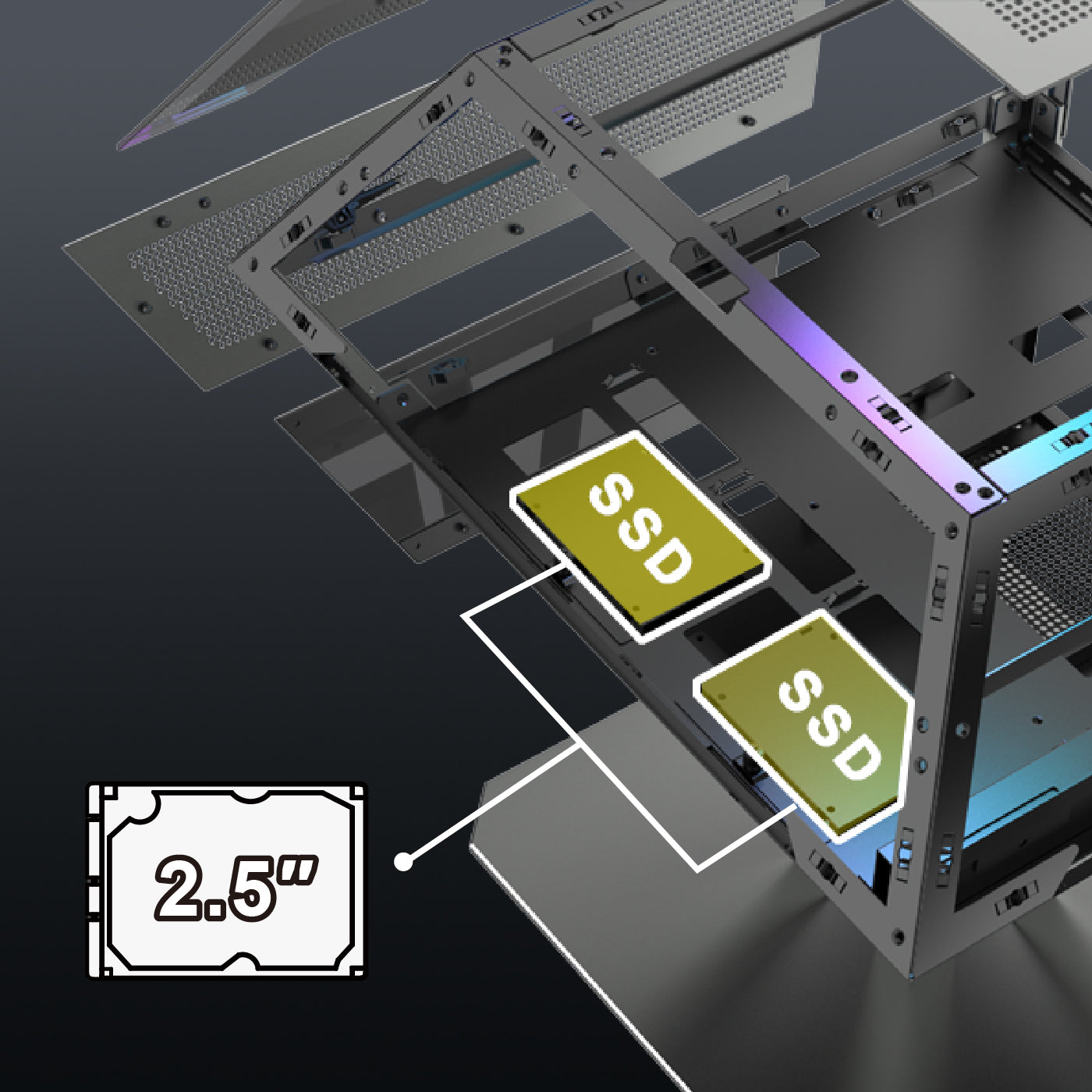 Equipped with a pre-installed 180 mm digital RGB fan on the top panel, the DIAMOND presents an intuitive air intake design that draws in airflow through wraparound mesh panels and glass panels, optimizing the airflow path for effective system cooling.