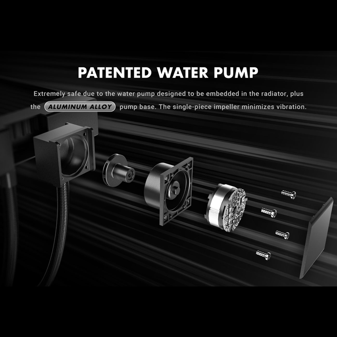 Extremely safe due to the water pump designed to be embedded in the radiator, plus the ALUMINUM ALLOY pump base. The single-piece impeller minimizes vibration.