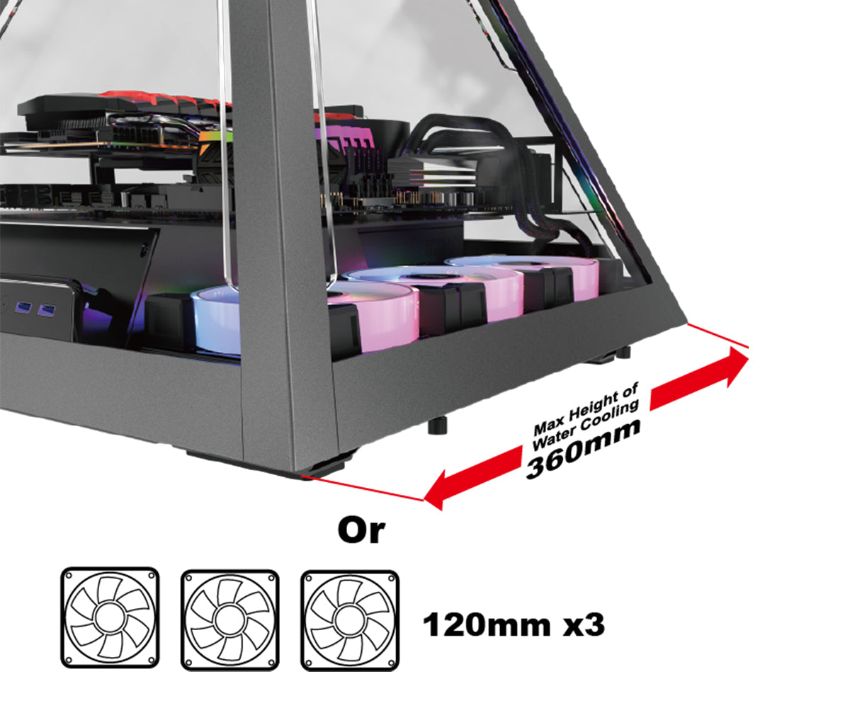 Supports water cooling up to 360 mm in length or 3 x 120 mm fans