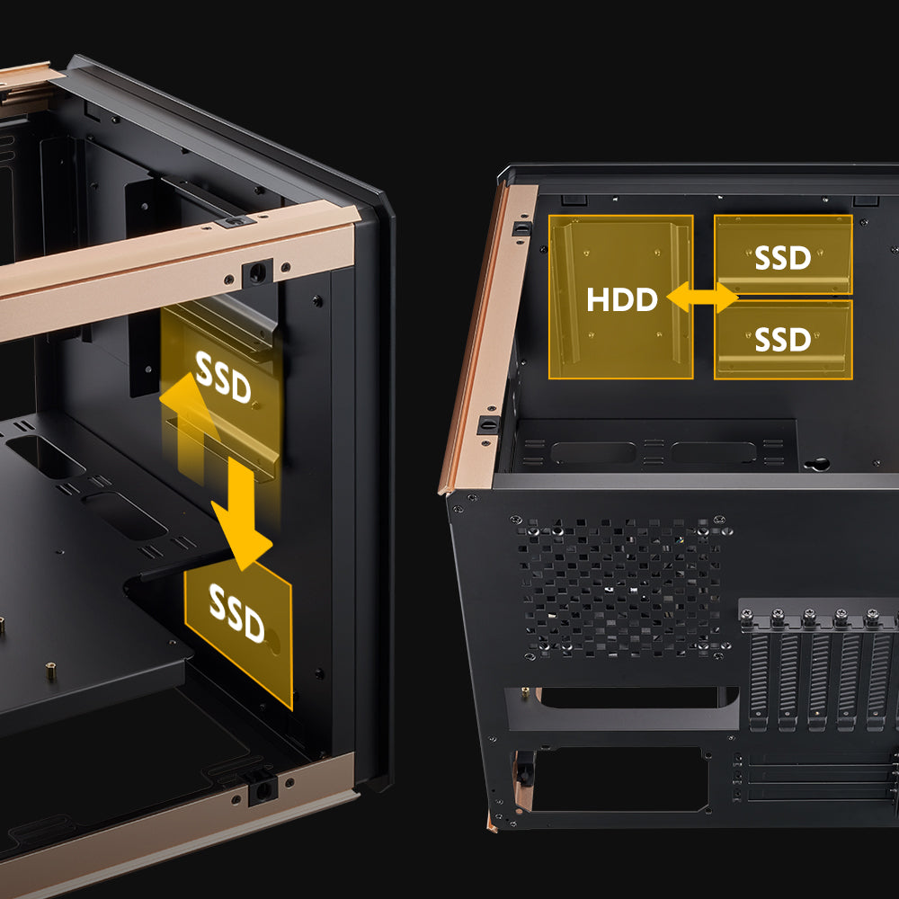 The REGIS has multiple locations for storage. Fully accommodating 2 x 2.5" SSDs and 1 x 3.5" HDD that can be placed at different locations for optimal compatibility.