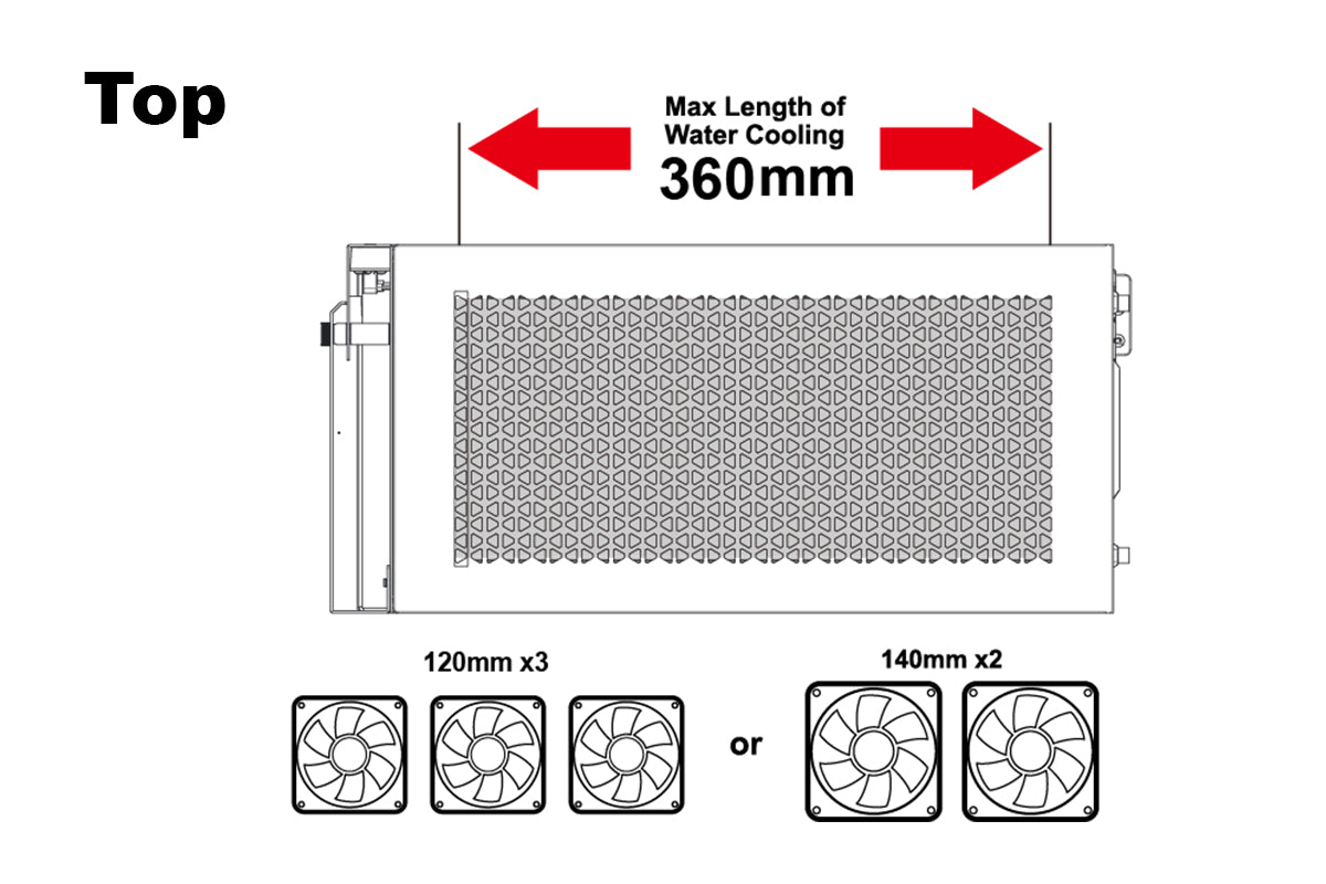 3 x 120 mm or 2 x 140 mm fan ports on the top